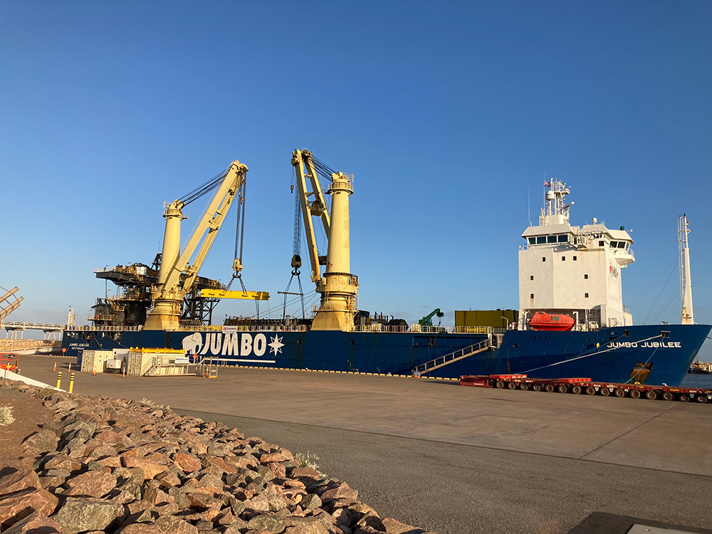 The BigLift vessel Happy Dover utilised the Port of Ashburton as its First Port of Entry, undergoing inspections by DAFF and Australia Customs. This marked the first international vessel to berth at the port since it was officially handed back to the State — a significant milestone in the port’s operational history.